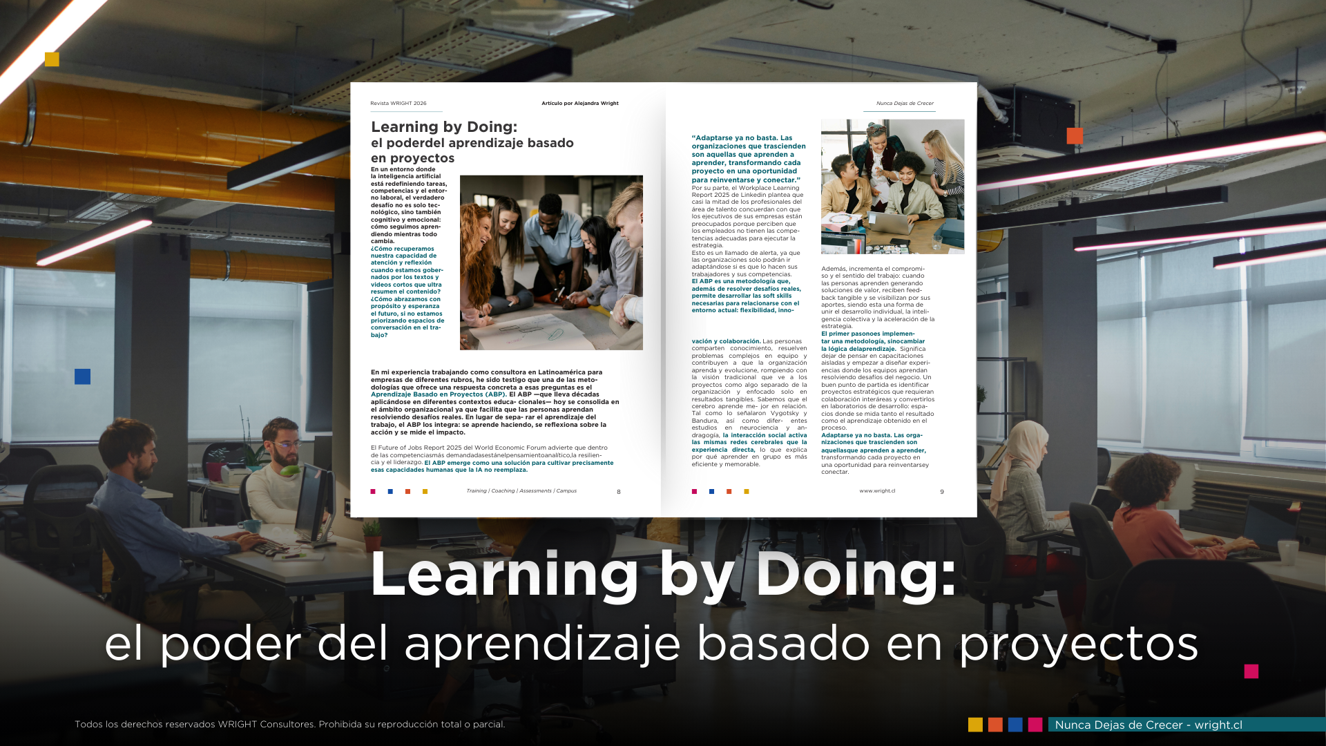 ¿Cómo seguimos aprendiendo mientras todo cambia? Esa es la pregunta que nos hicimos al escribir este artículo para la edición 2026 de la Revista WRIGHT, donde Alejandra Wright profundiza en el enfoque Learning by Doing y en el poder del aprendizaje basado en proyectos como una respuesta concreta a los desafíos actuales del desarrollo de talento. Este mismo contenido también forma parte del Monográfico Español | Especial Formación 2025–2026 de AEDIPE, conectando nuestra mirada con las tendencias que están marcando el futuro del aprendizaje organizacional.
